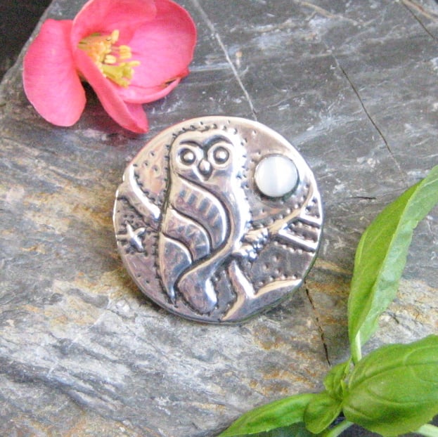 Small owl pewter brooch with mother of pearl moon.This sweet little brooch, measuring 32mm across, has been entirely handmade by me in my Wimbledon,UK,studio. Using the repousse method, I have raised the design of an owl sitting beneath a mother of pearl moon. There is a pin with a safety catch on the reverse.