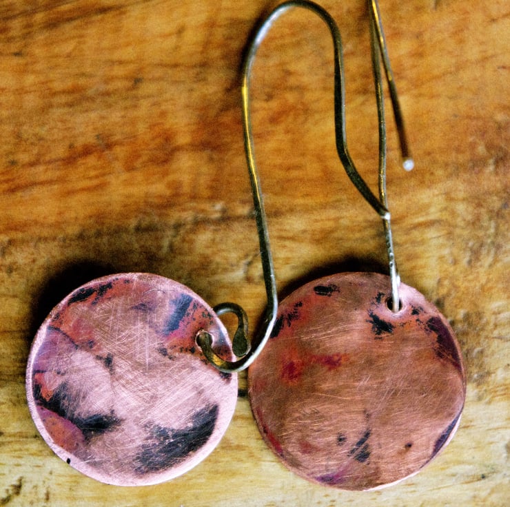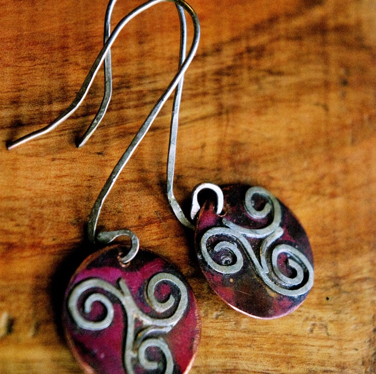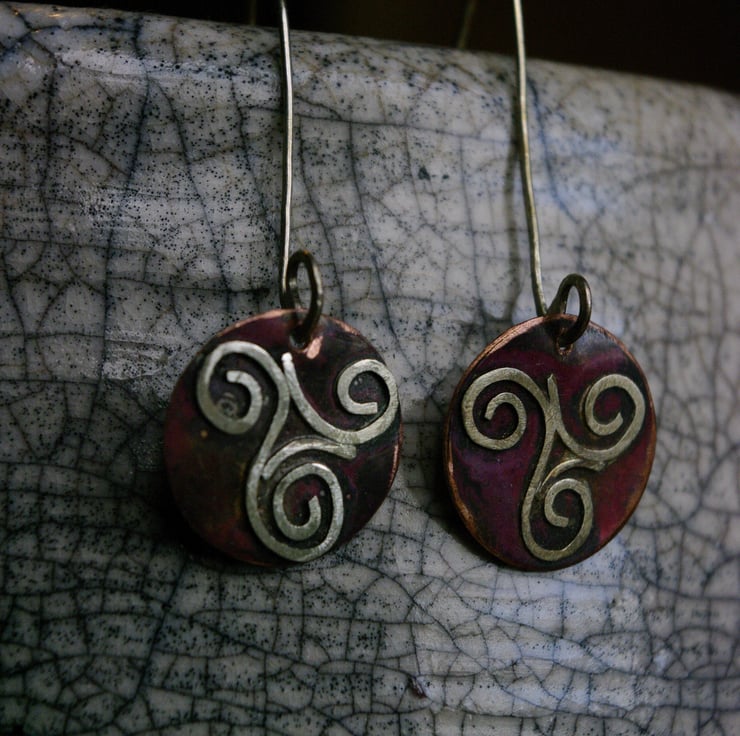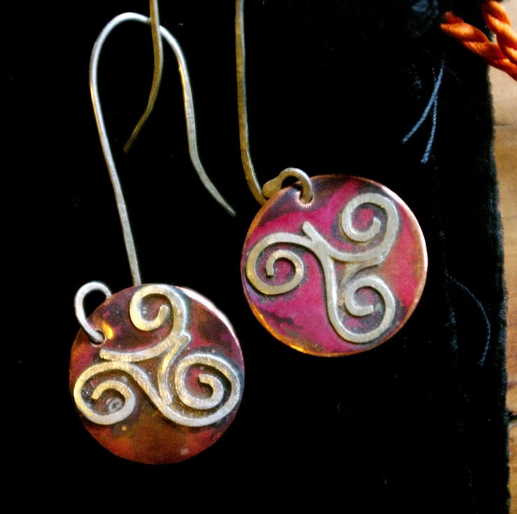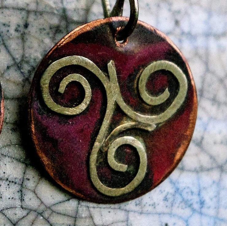 I have heat treated the copper discs to produce richer copper colours and soldered onto them, the Celtic triple spiral symbol. This is an ancient Celtic symbol for trinity and is interpreted in many ways; spirit,mind,body; past,present ,future; power,intellect,love. But all meanings are tied to growth and personally I like the interpretation, tied with the Celtic goddess Brigid, that it is about female energy /power .