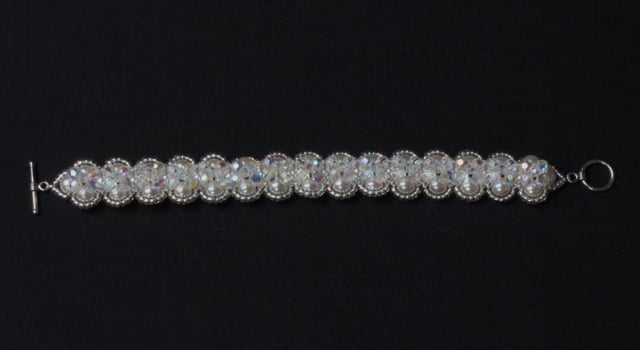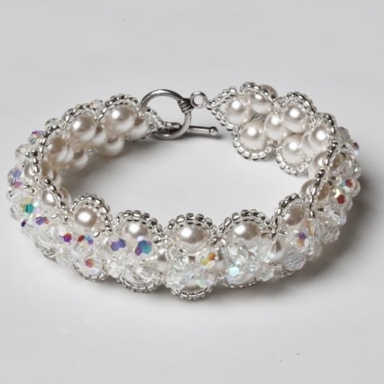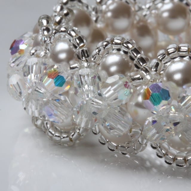 It is made from a right angle weave of high quality 6mm Preciosa glass ‘pearls’ embellished with 4mm round Preciosa crystals and 3mm bicone crystals. Both have an AB (aurora borealis) coating for extra sparkle. The bracelet is finished with tiny Miyuki silver-lined seed beads and a silver-plated toggle clasp.