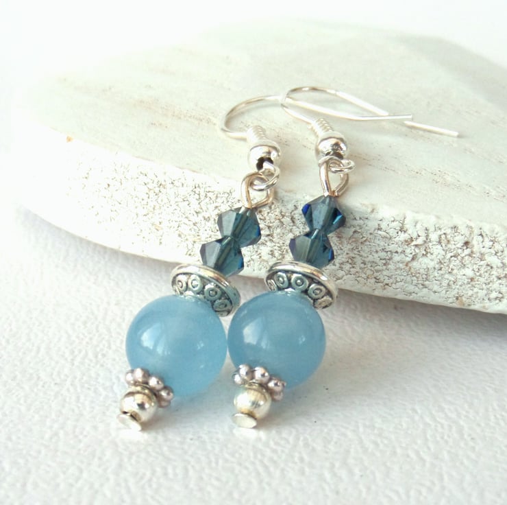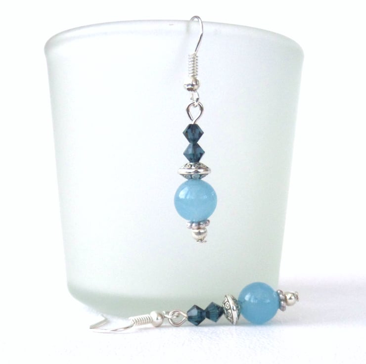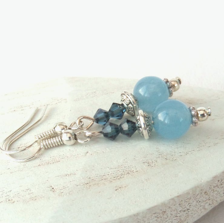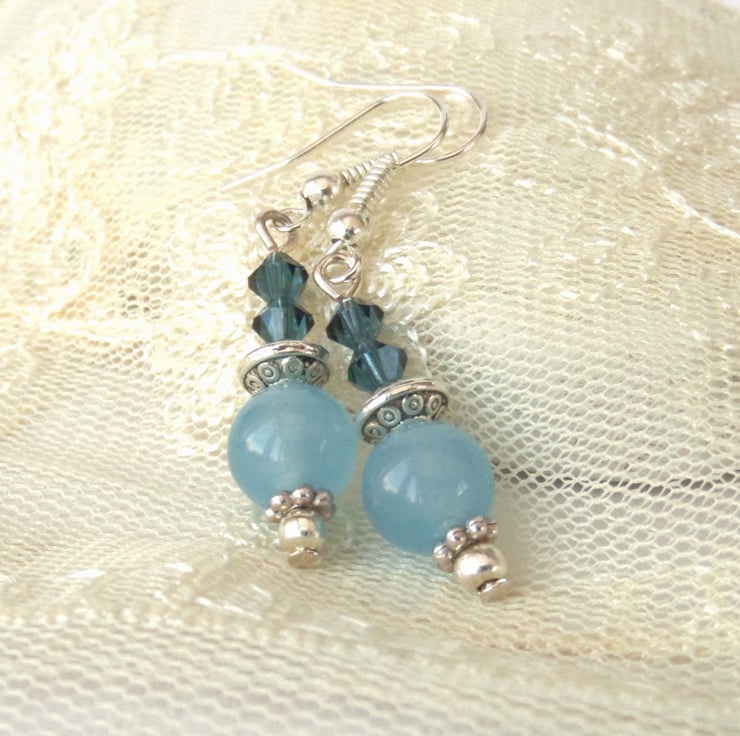 Blue jade hangs with pretty Swarovski® crystals from silver plated wires to create these lovely handmade earrings.