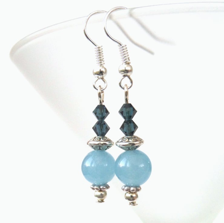 Blue jade hangs with pretty Swarovski® crystals from silver plated wires to create these lovely handmade earrings.
