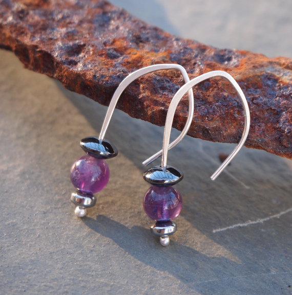 Purple amethyst spheres have been teamed up with small hematite beads to make these simple drop earrings.