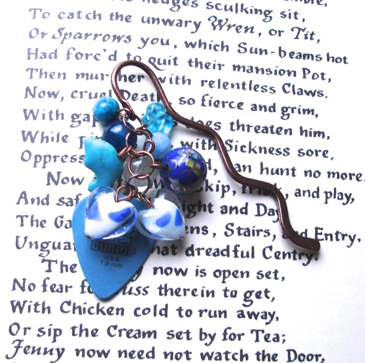 This super cute and unique bookmark features a wonderful cluster of blue beads on copper plated pins, finished off with a hand drilled tortes plastic blue plectrum. Very rocker chic! The stem piece sits between the pages of your book and the beads dangle down your book's spine. A stand out piece which is perfect for any bookworm and will really prompt conversation.