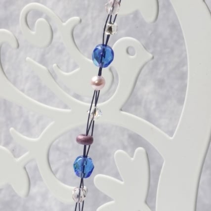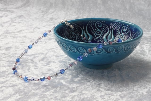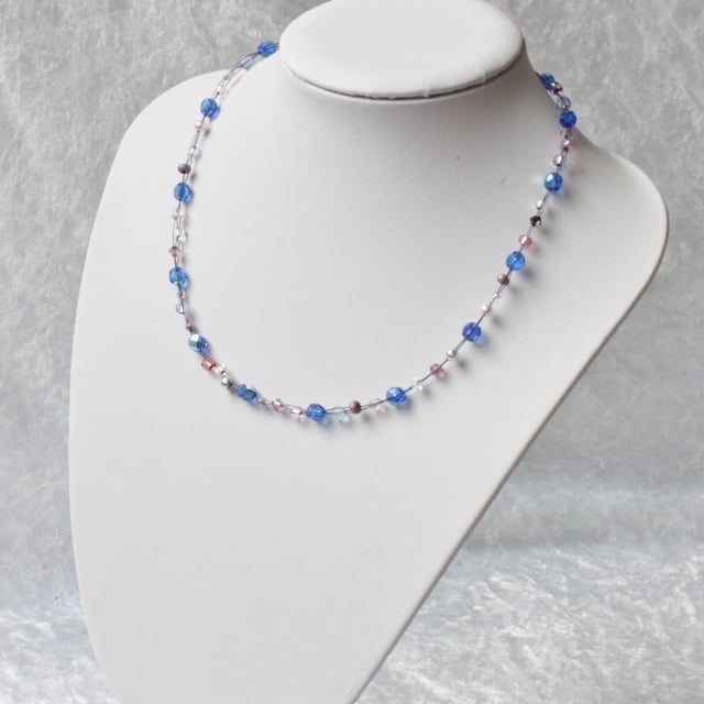 This sweet little necklace is made from twisted strands of blue nylon coated wire threaded with 6mm sapphire blue faceted beads and seed beads, glass pearls and bicone crystals of varying sizes and shades of pink and silver. The faceted beads have an AB (aurora borealis) coating for a bit of extra shine. The necklace is finished with pretty plated silver seashell calottes and a trigger clasp.