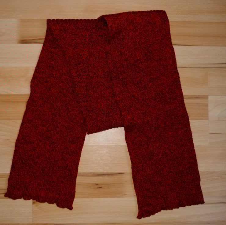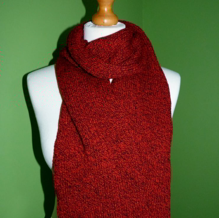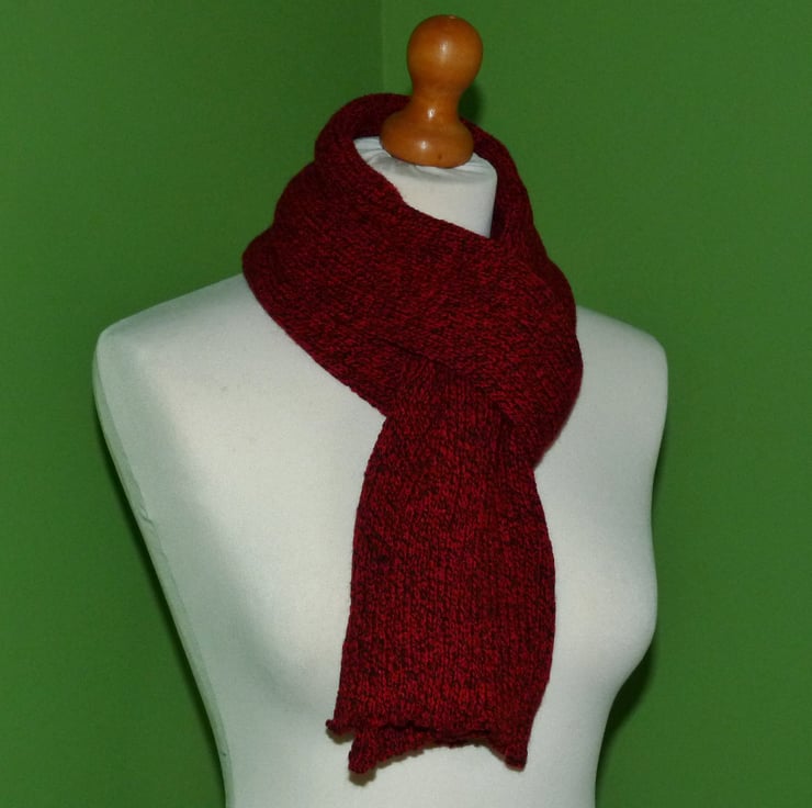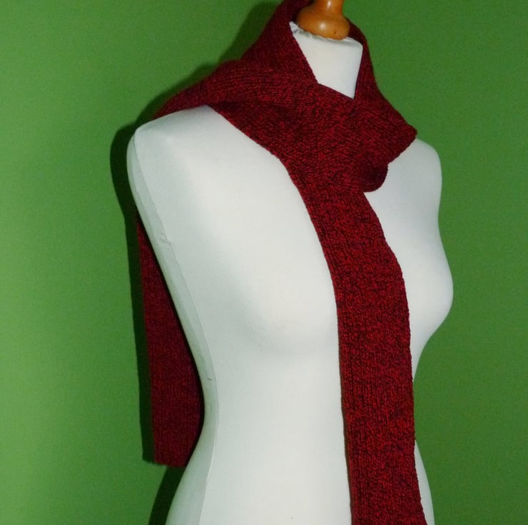 I have created this double rib scarf from acrylic yarn in red and black. It has been hand crafted on a Knit-master knitting machine. The scarf has been washed and blocked and is lovely and soft. The double rib gives a nice thickness to the scarf.