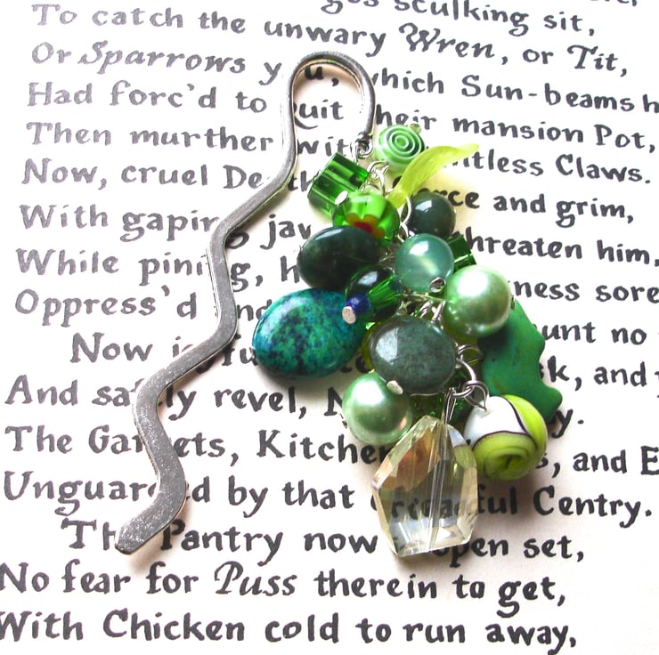 These cluster bookmarks are ever so popular! This uber-funky, very bright and unique bookmark combines a fantastic cluster of green beads and charms on silver plated pins. It contains moon, leaf, butterfly and dolphins beads and charms. The bookmark stem piece sits between the pages of your book and the beads dangle down your book's spine. A stand out piece which is perfect for any bookworm and will really prompt conversation.