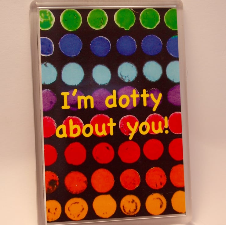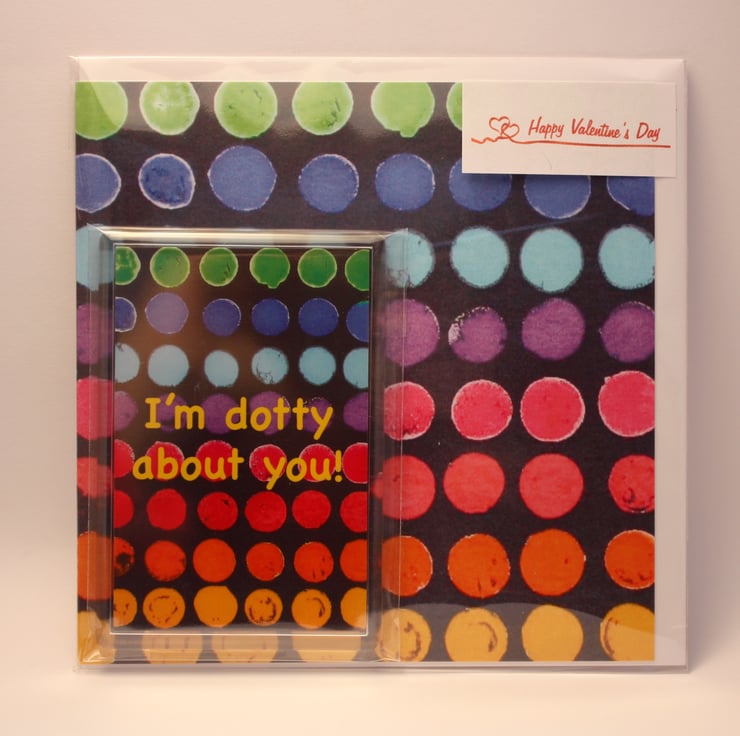 This dotty screen print that I made in my little home studio makes a delightful Valentine's card. It is printed on recycled board (13.5cm square ) and comes packed with a white envelope in a cello packet. It comes with a fridge magnet which says 'I'm dotty about you!'to slip inside the card. The card is blank for you to add your own message...don't forget to disguise your writing!!