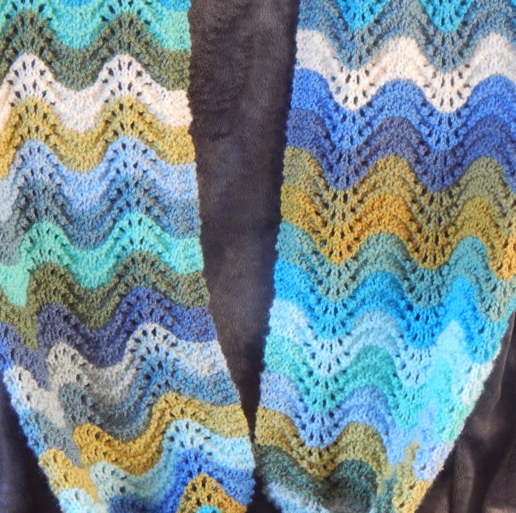 This infinity scarf/ snood/ call it what you will is made of beautiful blue and green yarn with a dash of cream thrown in for good measure to liven it all up a bit. It's beautifully soft, knitted in acrylic yarns, so no scratchy wool around your neck and chin. It also washes brilliantly. It's long enough to twist twice around your neck and still have plenty of room. Gorgeous!