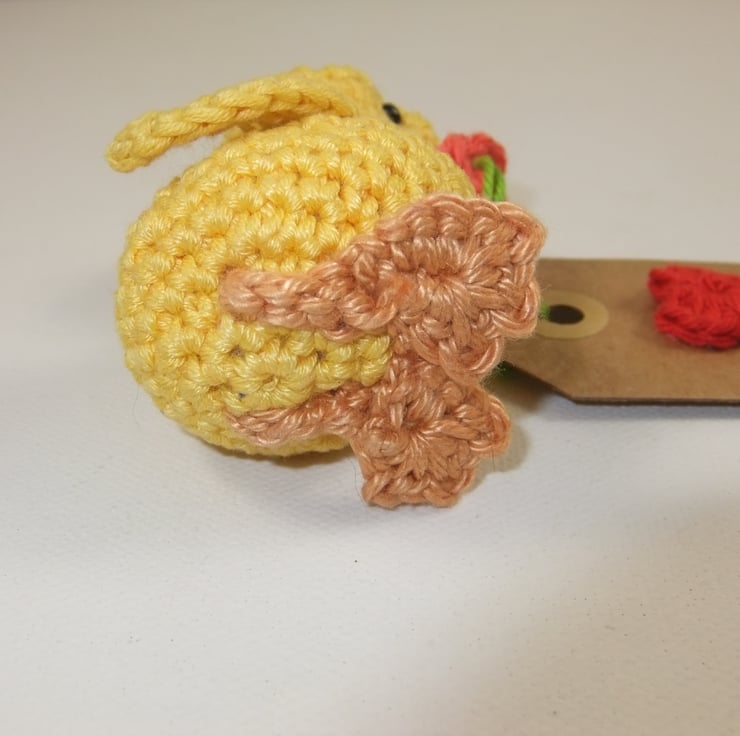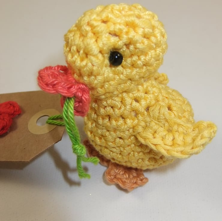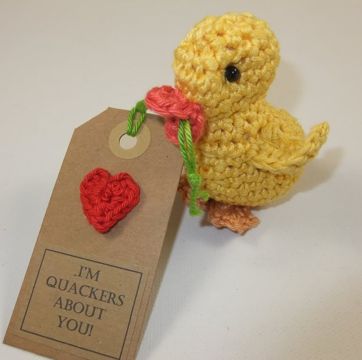 An alternative to a card, this sweet little duckling carries a message to your loved one on your behalf! It has been adapted from a pattern by Karla Fitch (itsybitsyspidercrohet.blogspot.com) and crocheted in 100% cotton. It stands approximately 7 cm tall and carries a tag bearing a tiny crocheted heart and the message ‘I’m quackers about you!’ (though I’m happy to exchange this for a tag with a message of your choice.) It comes wrapped in tissue and in a PIP (Posting in Proportion) box with a ‘Just to say…’ label on the front. It can therefore be posted as a large letter rather than as a parcel; it may just need a little plumping up on arrival!