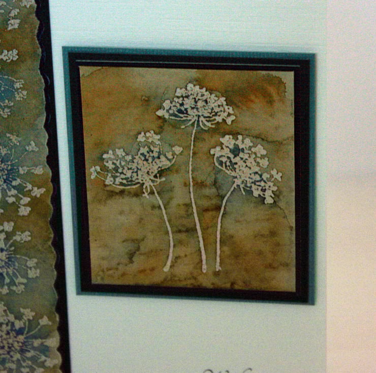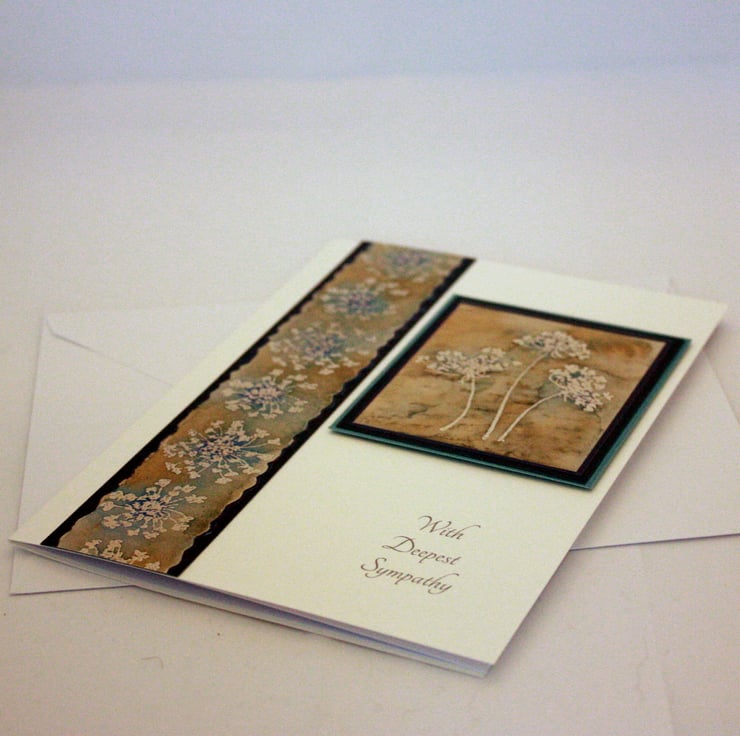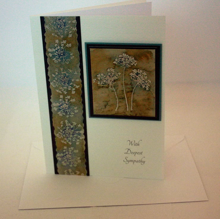 Sympathy card featuring a pretty floral image layered onto dark blue and light blue card, together with a co-ordinating border strip. The message 'With Deepest Sympathy' has been printed directly onto the card in dark grey ink.