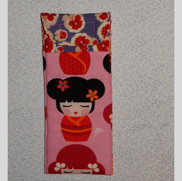 This is a handy case for your glasses or sunglasses. It is made from two fabrics, one featuring Japanese ladies and the other a toning floral print. It is lined in a toning fabric, and has a layer of wadding for protection. The case fastens with velcro.