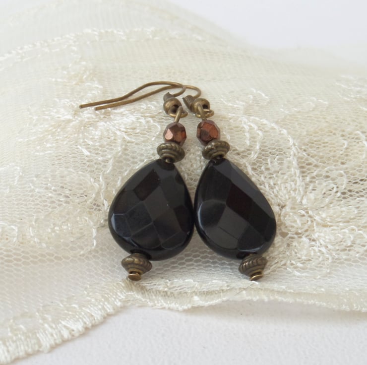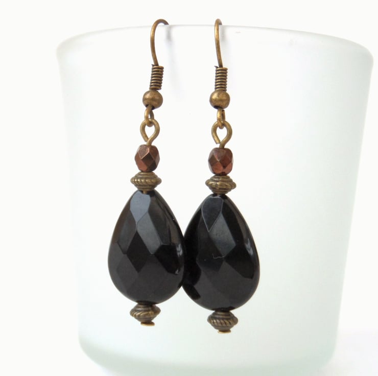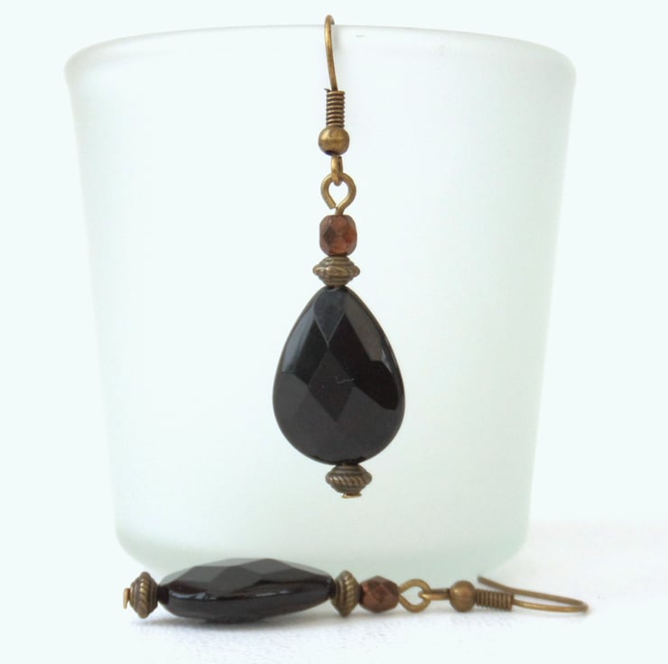 Beautiful teardrop shaped polished black onyx gemstones hang from bronze earwires with rich brown crystals and little bronze beads.