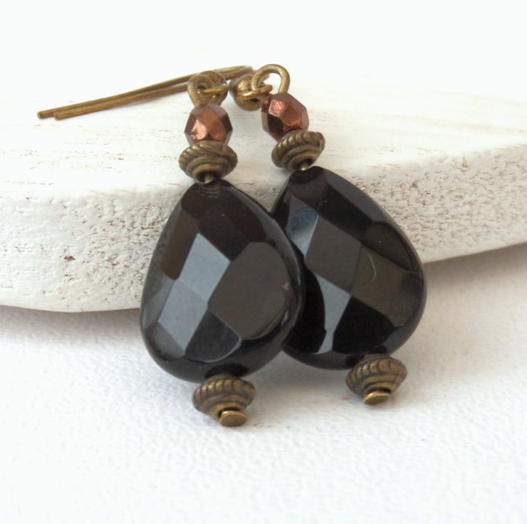 Beautiful teardrop shaped polished black onyx gemstones hang from bronze earwires with rich brown crystals and little bronze beads.