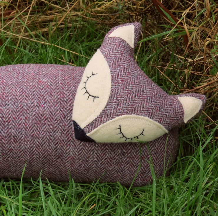 Snoozy fox is made from a tactile herringbone wool in shades of lavender.