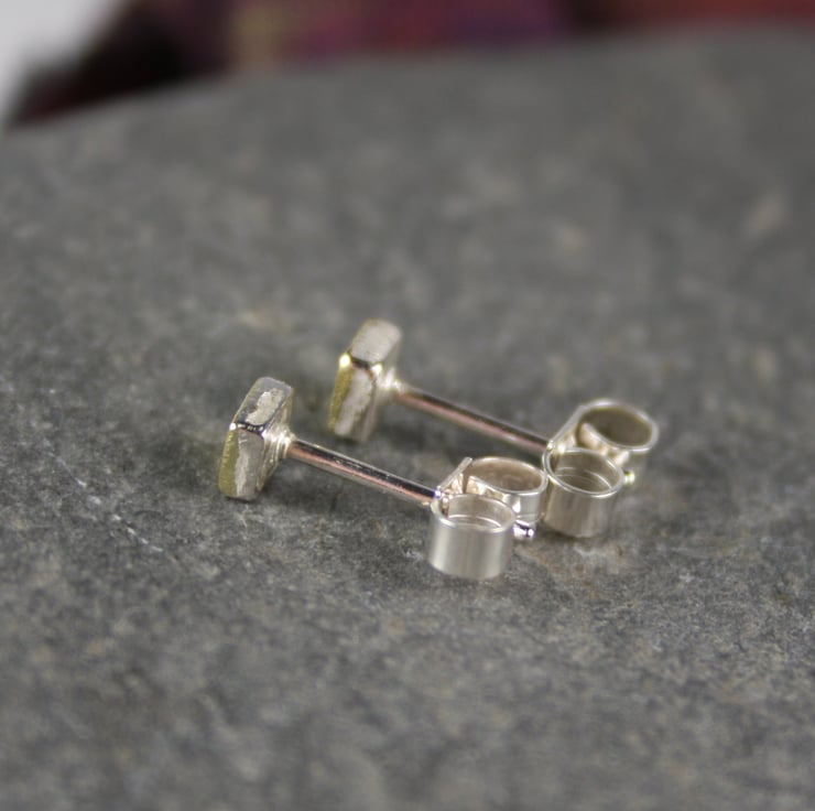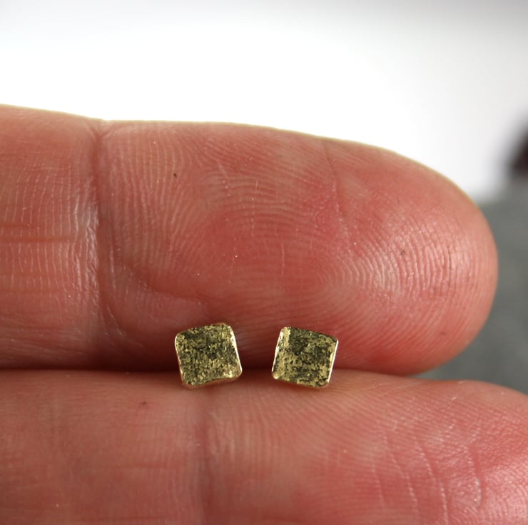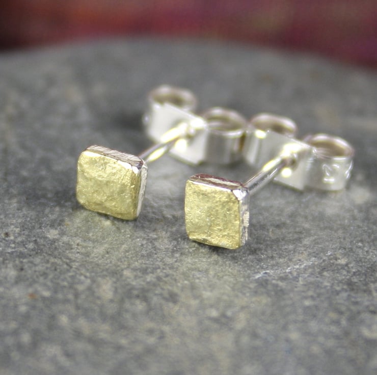 I have soldered a thin sheet of 18 ct gold to a thick sheet of silver , then cut out and textured these little square studs, the posts and butterflies are sterling silver too. They have been burnished to a subtle shine - ( you could have a matte finish if preferred) .