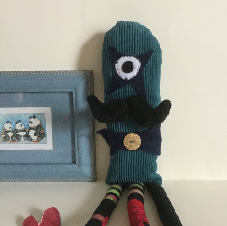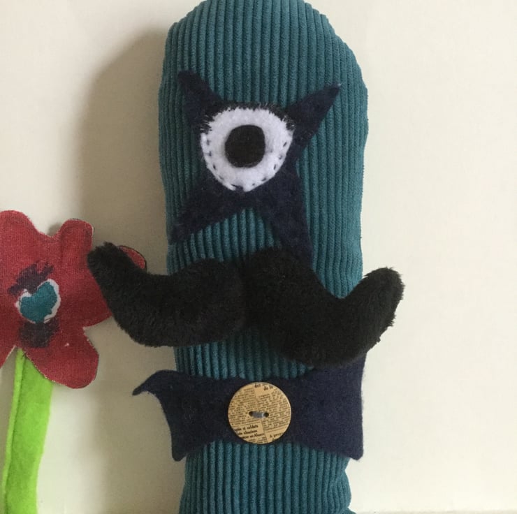 Monsieur Star is a one eyed performer with three legs. He is handmade and very cuddly and has a very plush moustache. Great for children to play with and use their imaginations.
