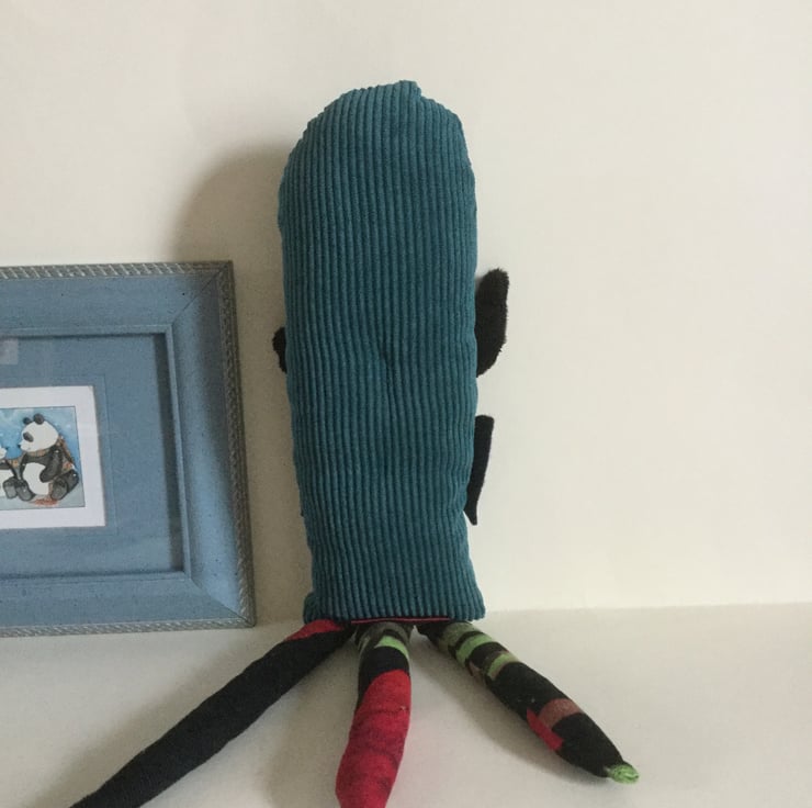 Soft Jade corduroy with baby corduroy multicoloured legs and a black plush moustache.