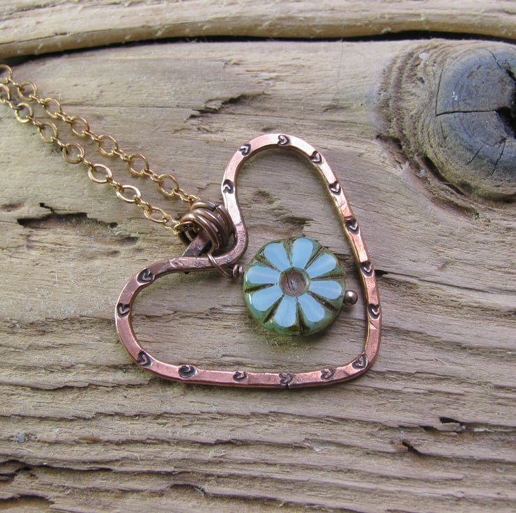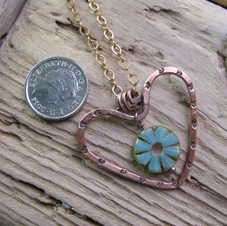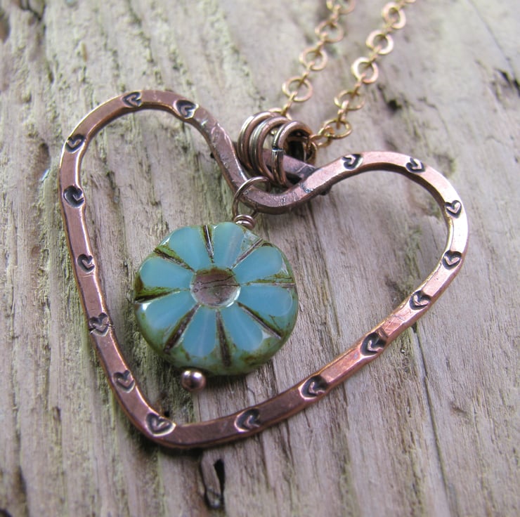 Made from thick copper wire, bent into a heart shape, soldered, hammered and stamped with tiny hearts. I have attached a Czech bead to the centre for some colour. Suspended from a copper chain approx. 18".