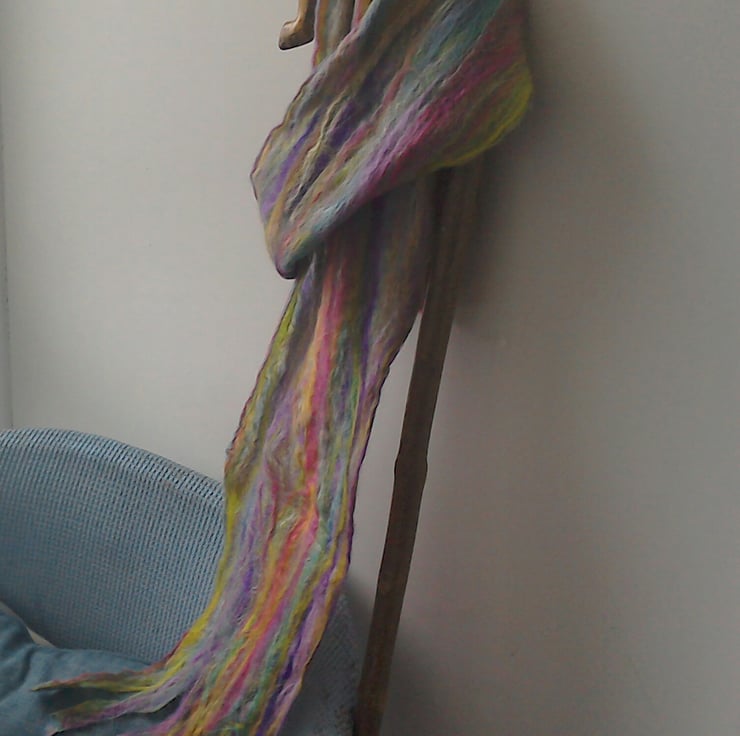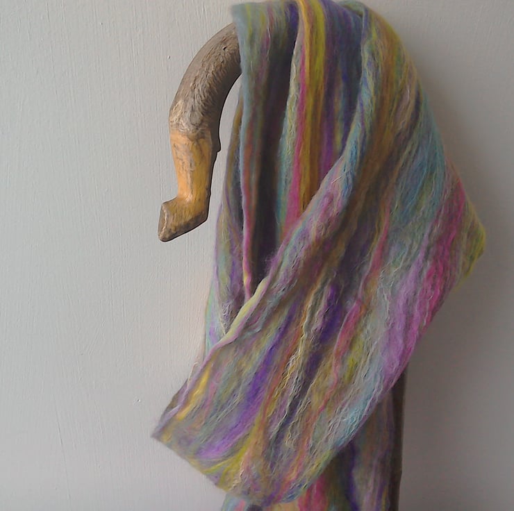 This pretty, handmade scarf is wet felted in fine layers for a very soft, lightweight feel. The scarf is made from 70% merino wool and 30% silk which gives it a fine texture and means the scarf hangs and drapes well.
