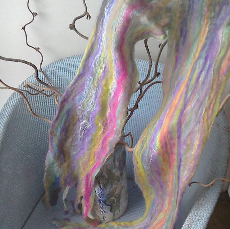 Colours always inspire me and I just had to buy some of this beautiful wool and silk fibre. It is ideal for a lovely floaty, soft scarf so I rolled up my sleeves and got felting. I wanted to achieved a light and flexible finished scarf which would drape nicely so tried out a cobweb style which has worked well. Mothers Day gift anyone?
