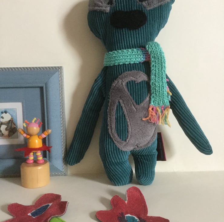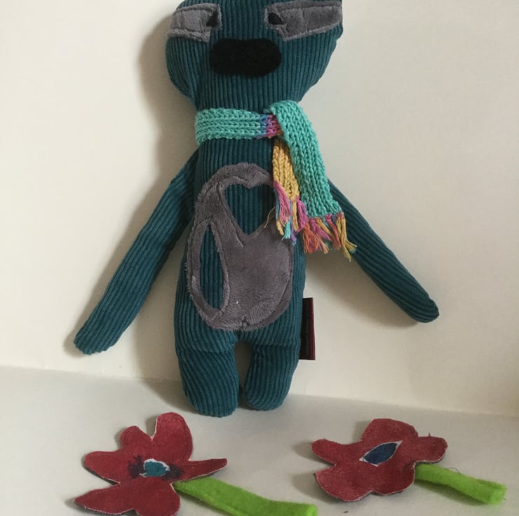 Super soft Jade corduroy body with black plush nose and grey plush eyes and large grey plush tummy and cut out heart. Black Embroidered eyes.