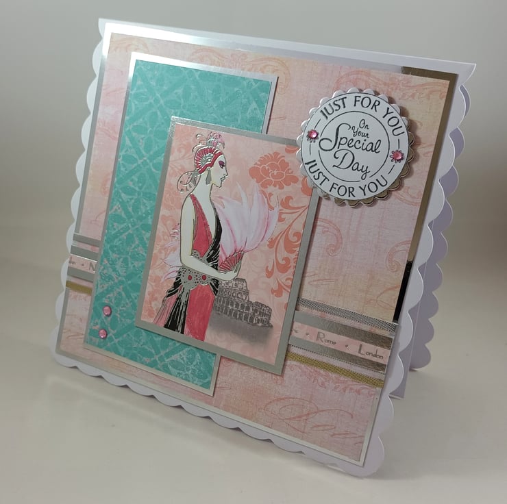 Square scalloped greetings card, suitable for birthdays or any other special day. The card features an image of an Art Deco style lady, layered onto turquoise and pink patterned papers and finished with a silver and gold trimmed organza ribbon. The message 'Just For You On Your Special Day' has been hand stamped and finished with two pink rhinestones.