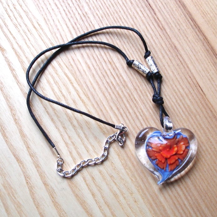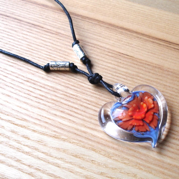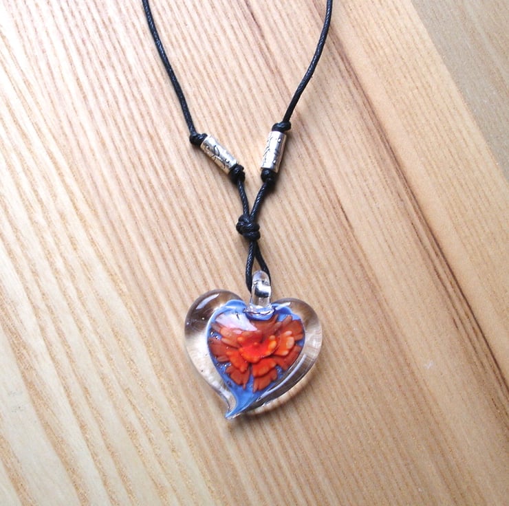 This lovely large glass pendant has an orange flower pattern on a blue glittered background, framed in clear glass. It has been strung on 2mm thick cotton cord, with tibetan silver accent beads added. The cord end crimps have been fastened on by hand and a silver plated lobster clasp and extender chain added. Fabulously kitsch and one of a kind!