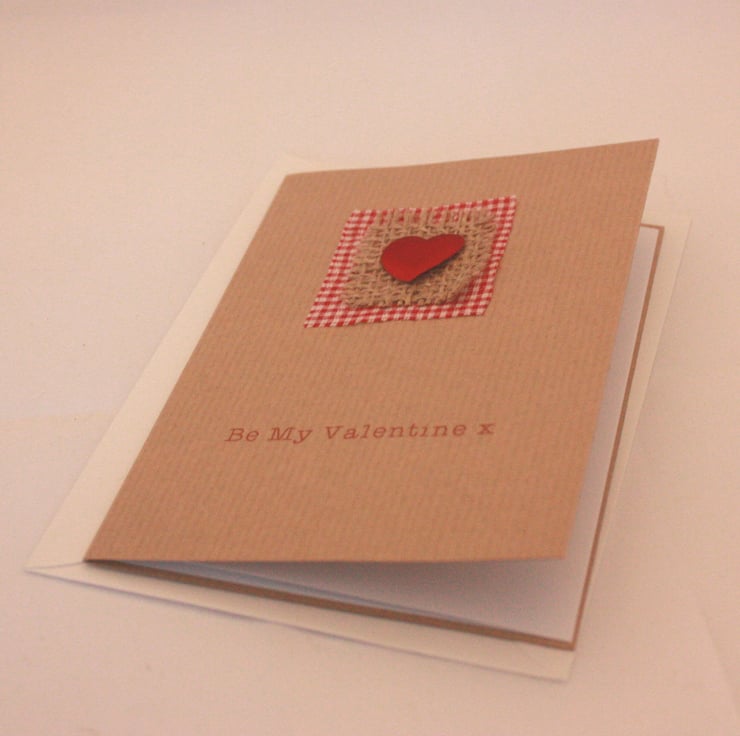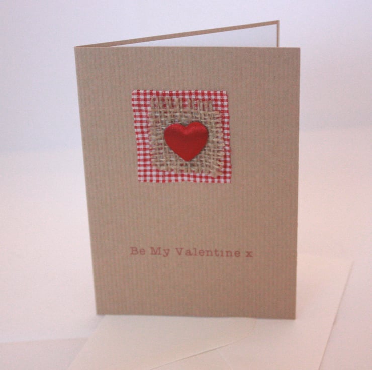 A6 Valentine's Day card, featuring a red, satin, padded heart, layered on hessian and red gingham fabric. The cardstock is recycled. The message on the front reads 'Be My Valentine' and inside reads 'Always and Forever'.