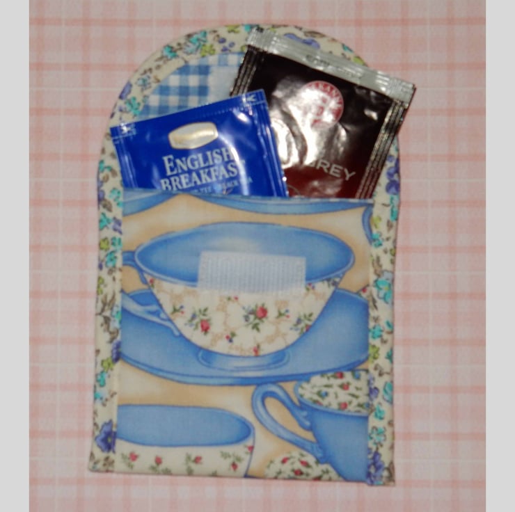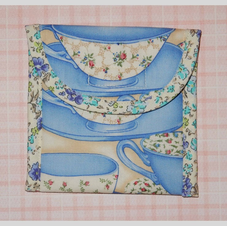 This mini wallet measures approximately 4.5 x4.5 inches (when closed).It is made from a beautiful fabric featuring traditional blue and white china, and trimmed with floral bias binding. It has a toning lining and fastens with Velcro. It also has a layer of cotton wadding. It would make a great wallet for your special teabags or pop in some plasters or painkillers for an emergency, to keep in your handbag.