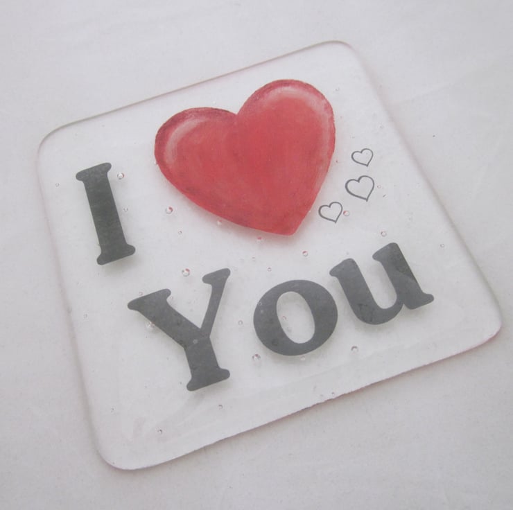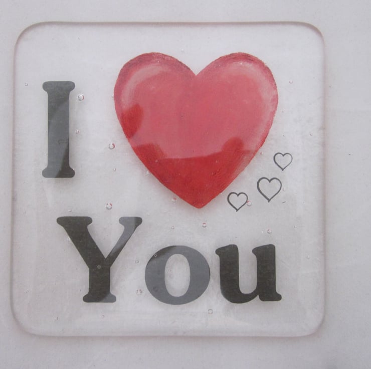 This coaster has an 'I love you' design on clear glass. It has been fully annealed to make it strong and is suitable for use with hot tea or coffee cups but not pans straight from the oven. It would make a great gift, secret santa or stocking filler. Ideal for Valentine's day.