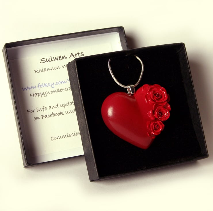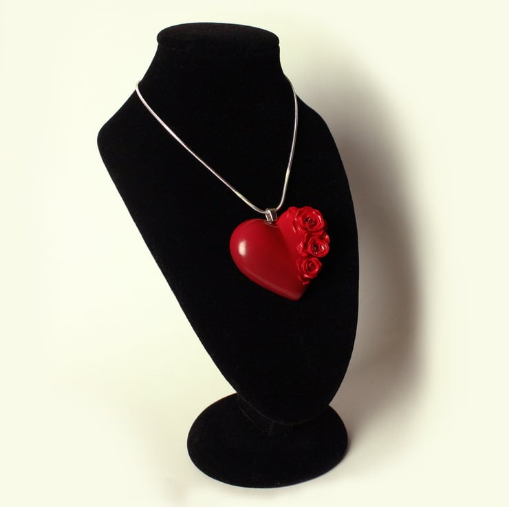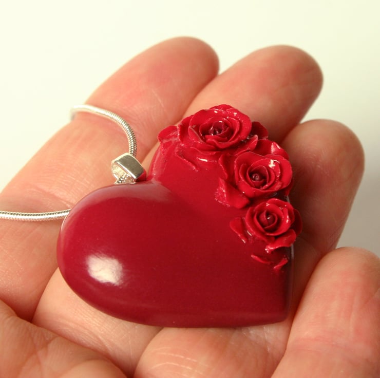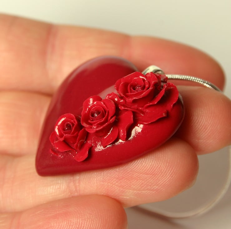 This necklace has been entirely handmade in polymer clay. I have used a technique with the coloured clay's to blend a darker red into a brighter one to give an interesting blushing affect. Each rose has then been assembled petal by petal and after baking it has been strengthened with varnish. The snake chain is 925 sterling silver, and it comes ready to gift to the object of your passionate love in a pretty black gift box.