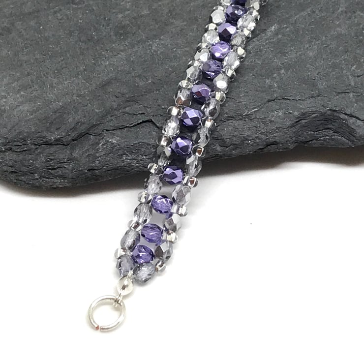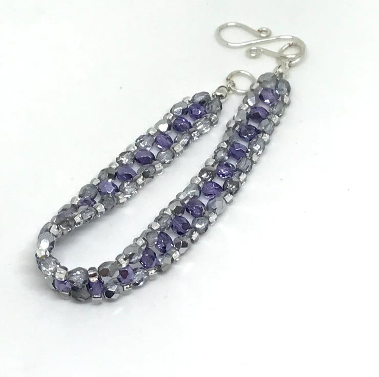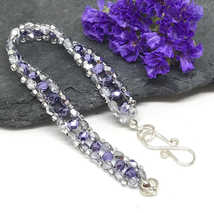 A very pretty and sparkly bracelet. I have created this bracelet with beautiful silver and purple faceted Czech crystal beads and silver lined seed beads. I have finished the bracelet with a handcrafted decorative 'S' clasp with silver plated wire which is very easy to fasten and comfortable on your wrist.