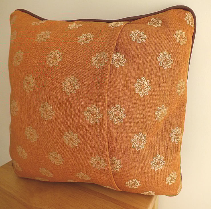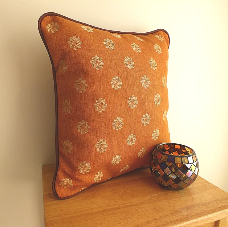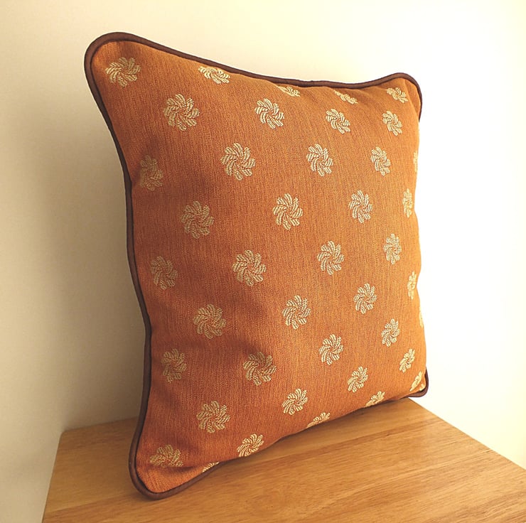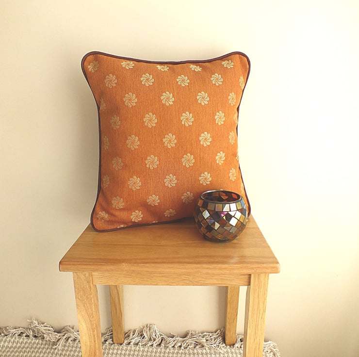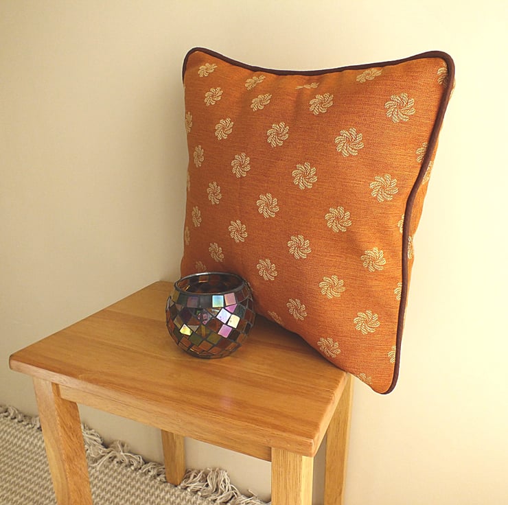 This stylish 14 x 14 inch cushion cover (polyester pad included) is as comfy as it is pretty! The material is a high quality cotton in burnt sienna, with simple pattern, complemented by brown piping.