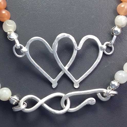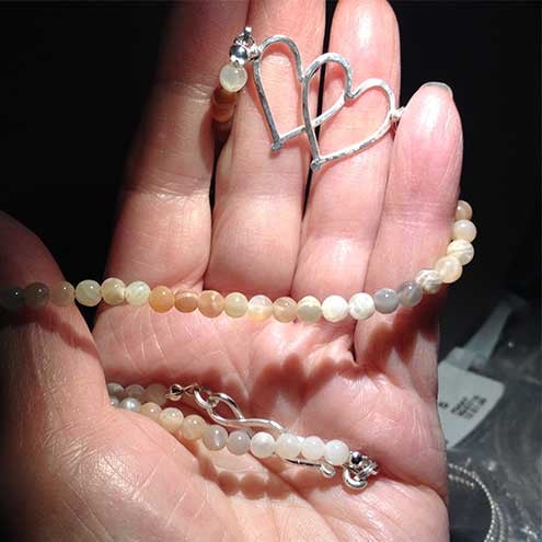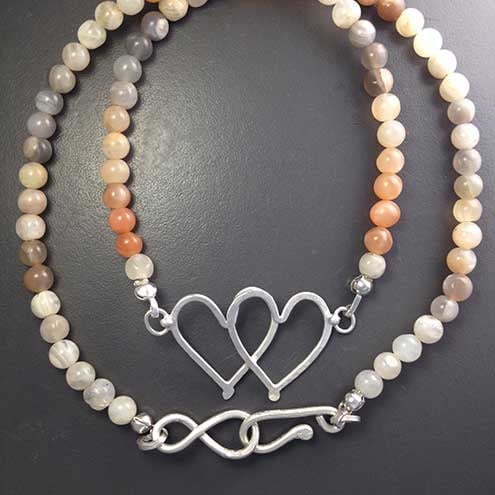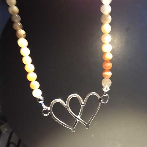 Subtle multi-coloured Moonstone beads make up this lovely necklace with a silver joined hearts charm as the focal point. The beads range from white through grey to peach colours and the silver hearts have been hammered for strength and texture. The necklace measures 18 inches with a handmade hook and eye clasp. This pretty and feminine necklace will make a lovely Valentine's gift for someone special.
