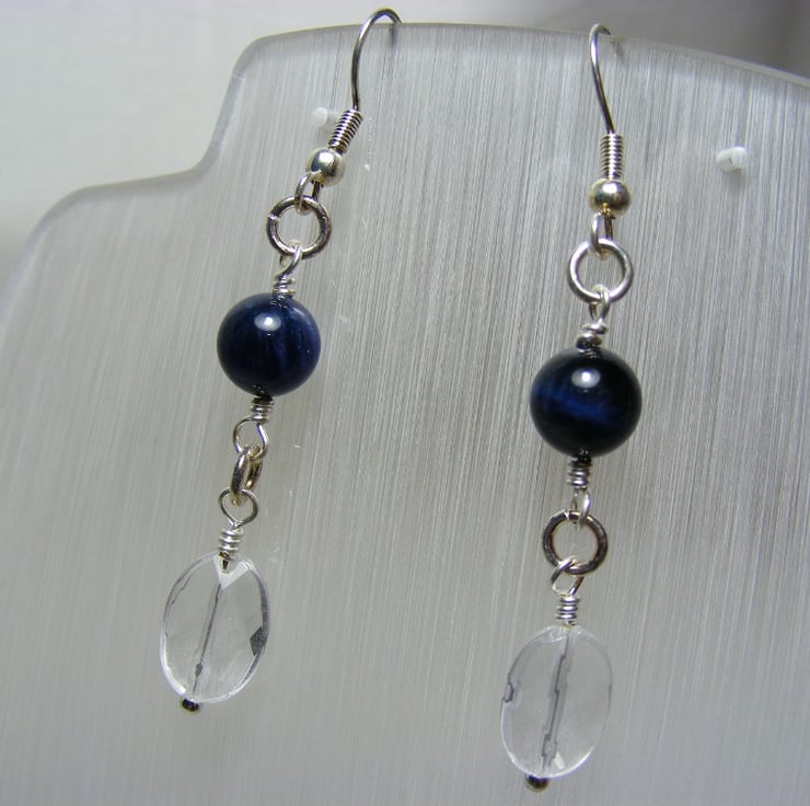 These lovely dangling gemstone earrings are made with 8 mm blue tiger's eye round beads, 12 x 7 mm faceted oval clear quartz and silver plated findings.