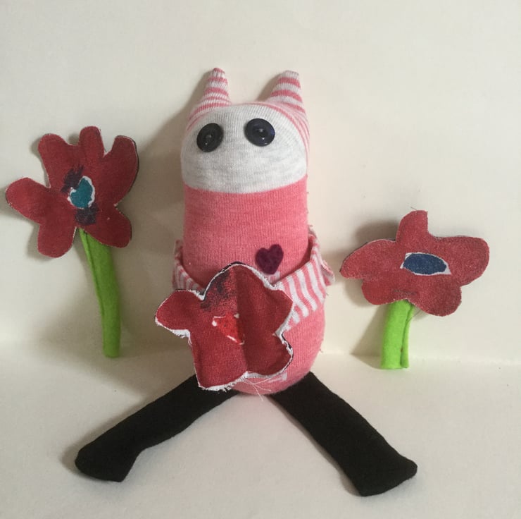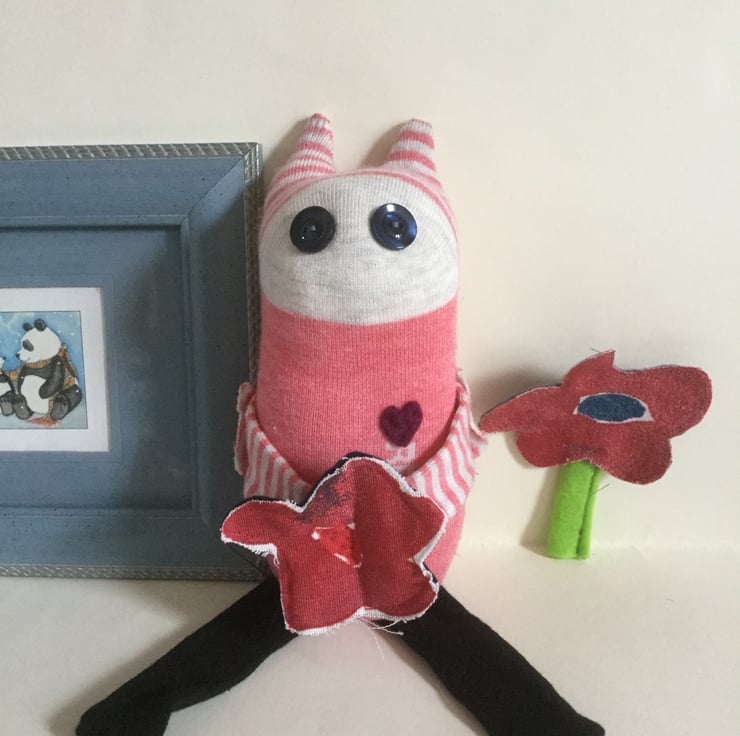 Soft Peach/White bamboo sock with black cotton rich sock legs which dangle. Button eyes, felt and cotton flower.