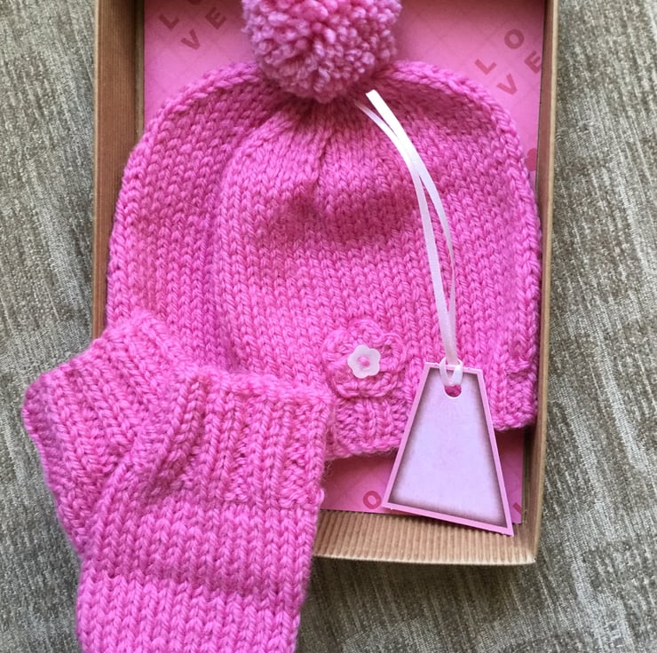 This hat and mittens set has been hand knitted in a pure wool good quality yarn to keep tiny heads and fingers warm.