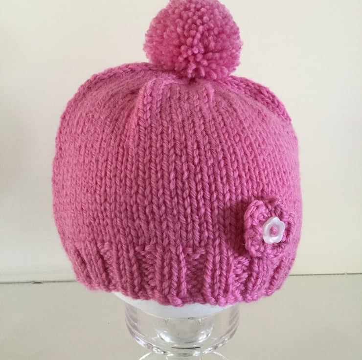 Made in a lovely bright pink finished off with a matching pompom, crocheted flower and flower button on the hat.