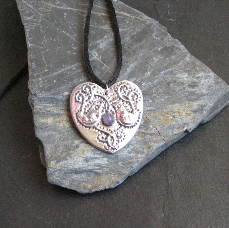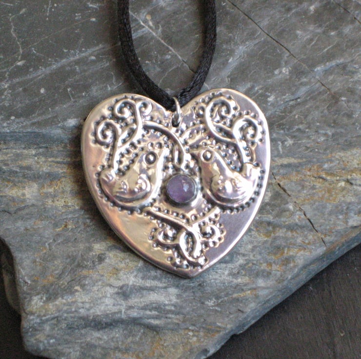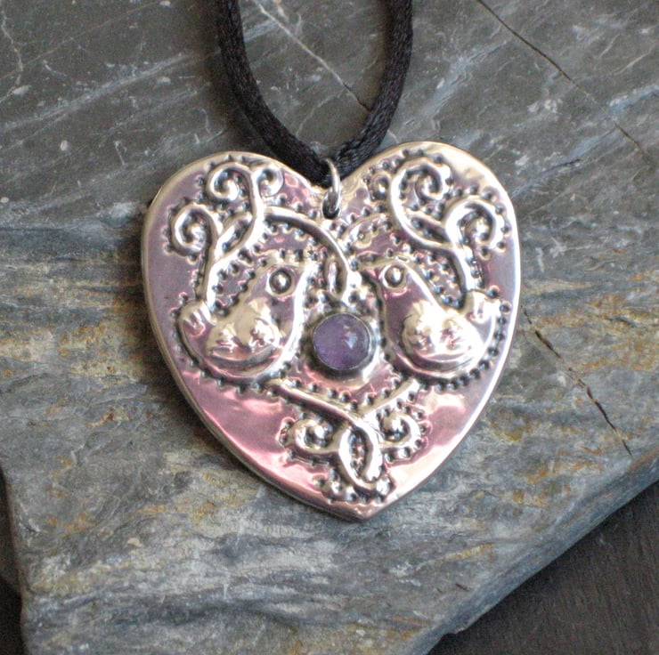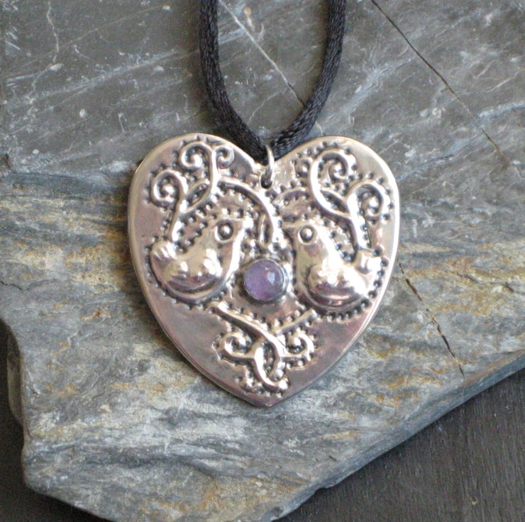 Silver pewter heart-shaped pendant necklace, bird design, with pale amethyst stone, handmade. I have embossed this original design in shiny sheet pewter, and set it with a genuine amethyst cabochon. Strung from a simple black fabric lace and gift boxed. Cord approximately 42cm long. Handmade in the UK.