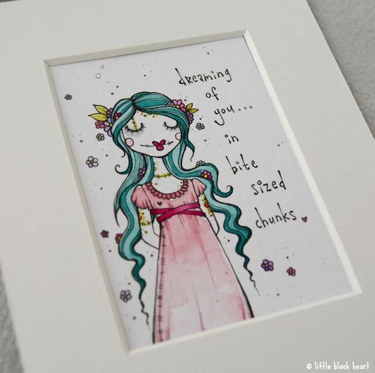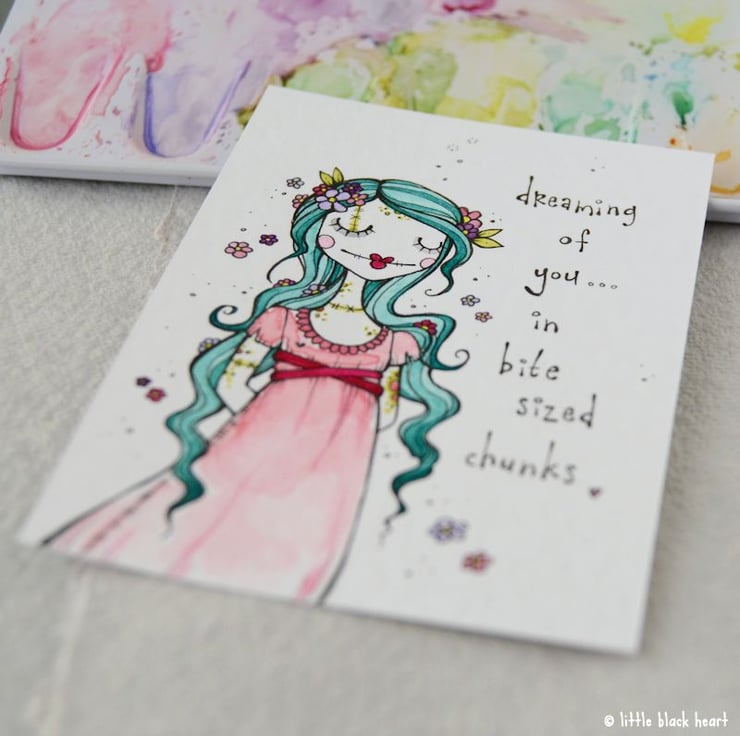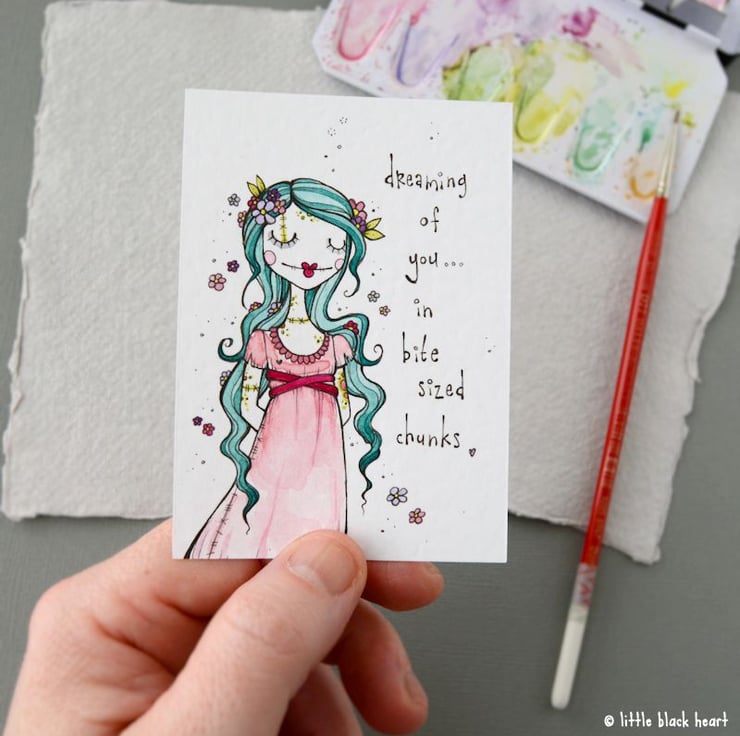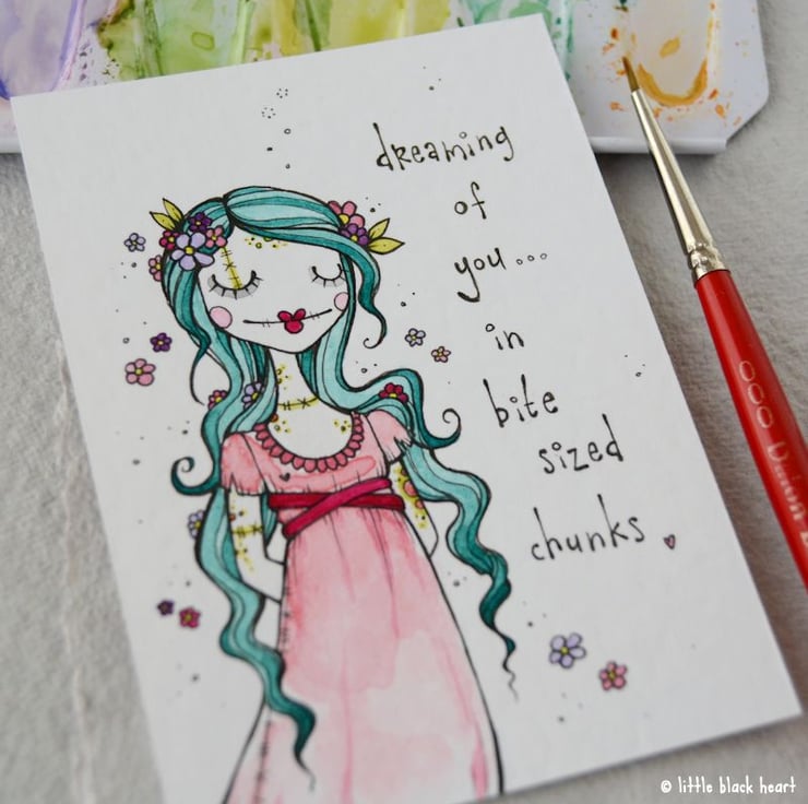 original artwork in artists pens and watercolour paints, on textured white 300gsm cardstock. drawn with a tiny 0.05 nibbed pen, and carefully painted with just the very tip of a tiny paintbrush.
