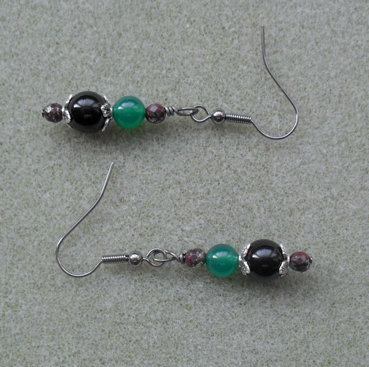 Black onyx with silver tone bead caps, green agate and small marcasite beads which are a deep gold with a hint of dark red in colour are attached to black tone ear wires