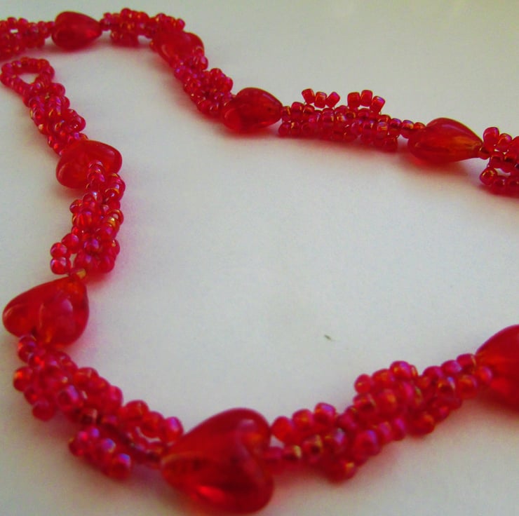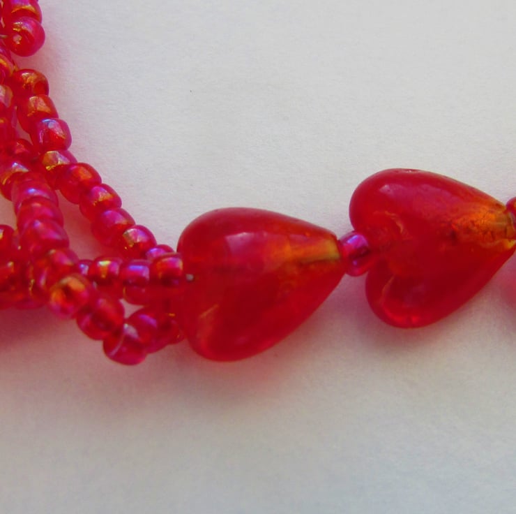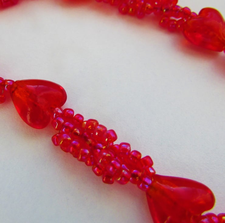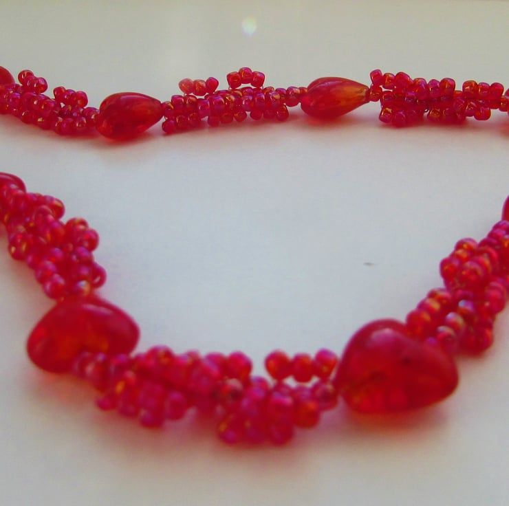 Pretty necklace made with red glass foil lined heart beads and red iridescent size 8 seed beads, these beads shimmer in day light, the seed beads in between the hearts has been stitched in spiral stich, the necklace is fastened by a seed bead loop and three glass hearts, it can be worn with the fastening to the front or back.