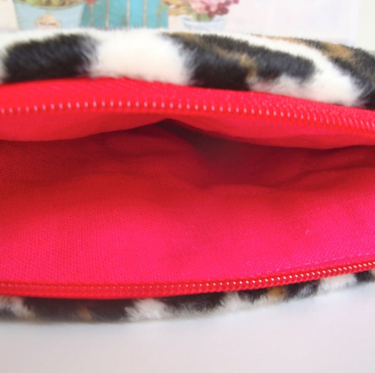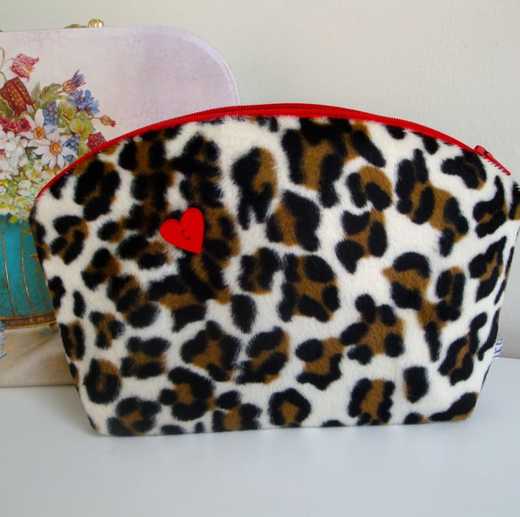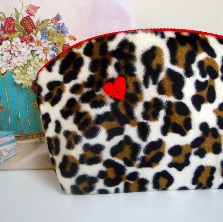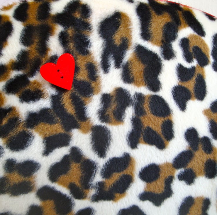 Made in a faux fur animal print fabric ( interfaced ) , with a cute heart button on the front .