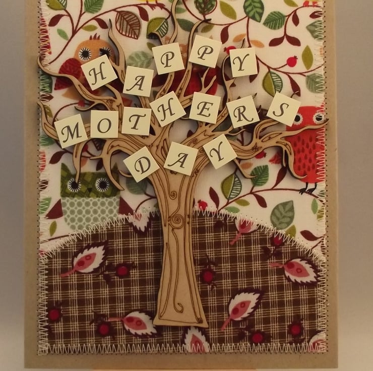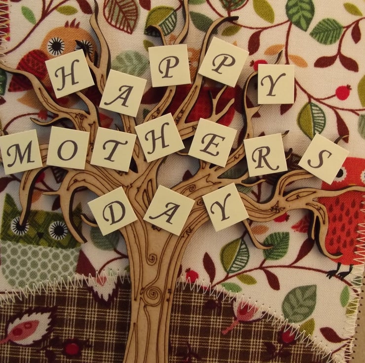 I have made the background of the card from fabric. The tree is wooden and to finish the card off I have added handmade lettering hanging on the tree branches.