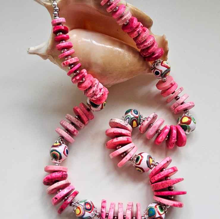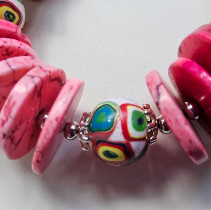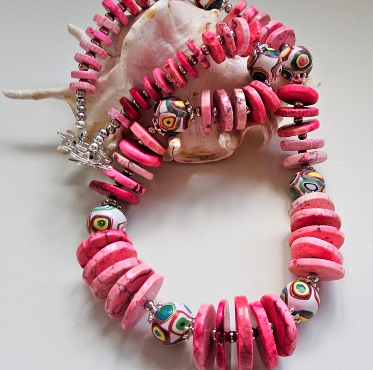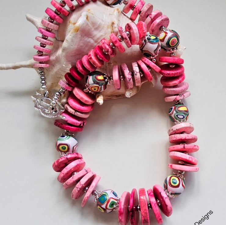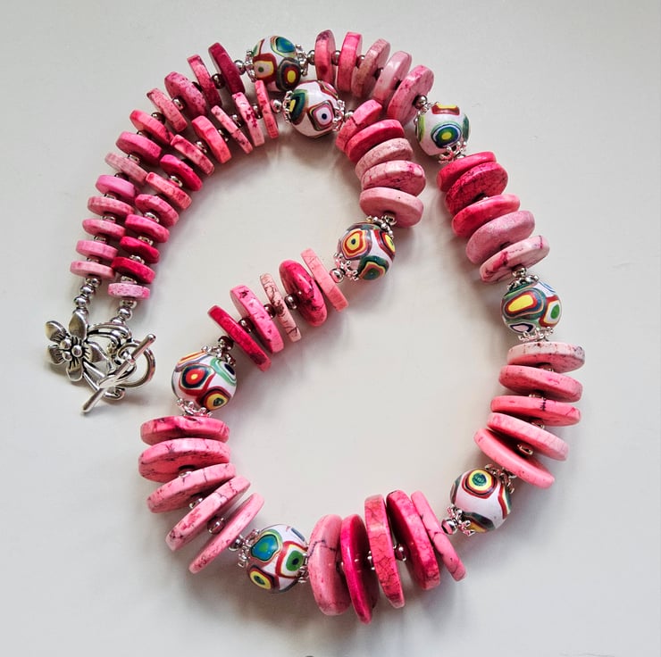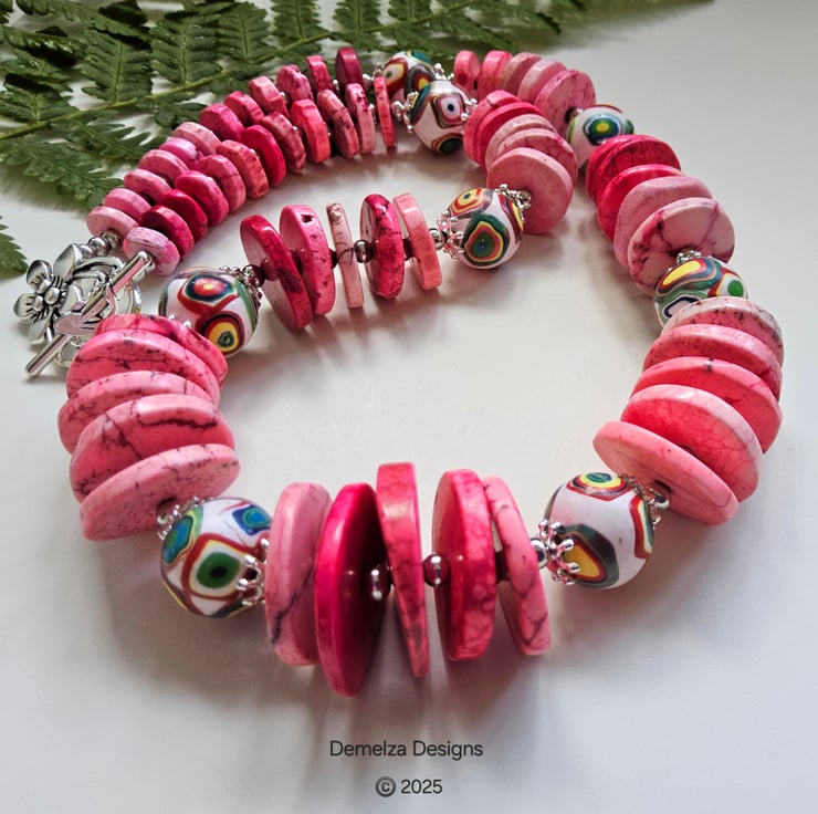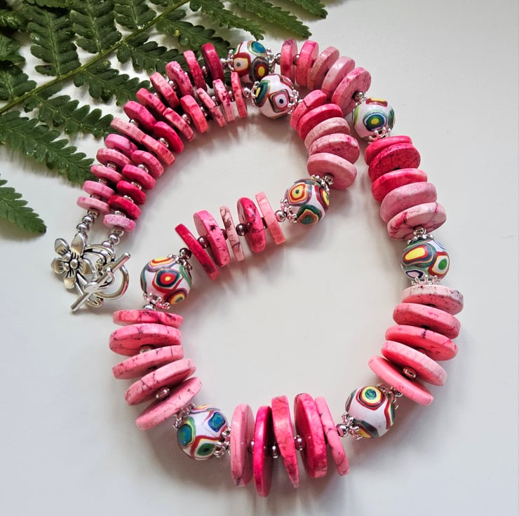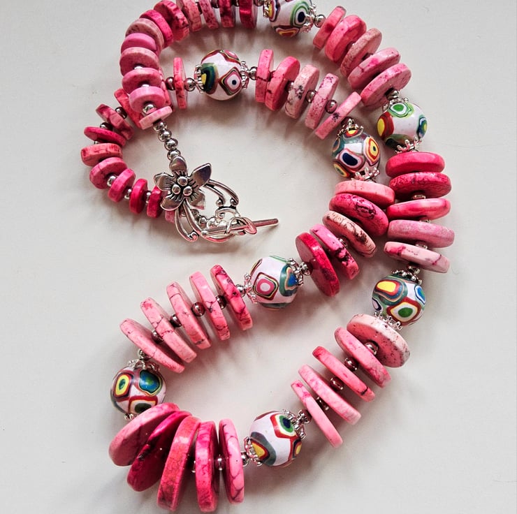 This statement howelite necklace has graduated irregular shape round gemstones complimented with my own hand made polymer clay beads. Between each gemstone is a siver plate spacer bead and between each polymer clay beads are decorative spacer bead caps. The necklace has been constructed using professional stainless steel jewellers wire for added strength and durability and finished off with a quality silver plated flower design toggle style clasp. All components are guaranteed nickel free by my findings supplier, thus no nasty possible skin reactions!