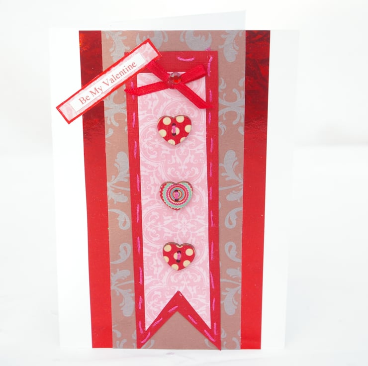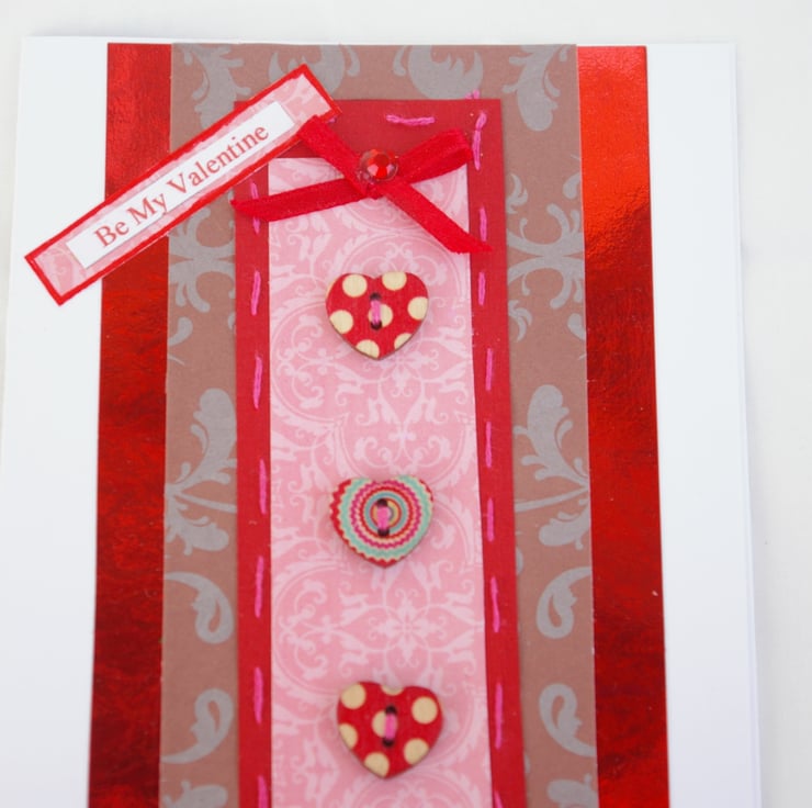 Valentine’s Day handmade card, featuring three small wooden heart buttons. These three pretty heart buttons are hand sewn onto a pink background. There are two red spotted buttons top and bottom and one multi little heart button in the middle.