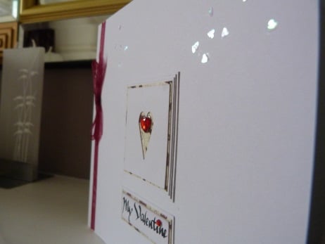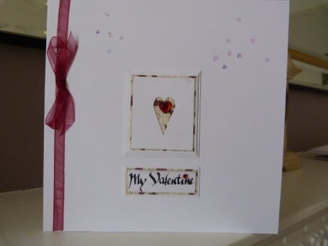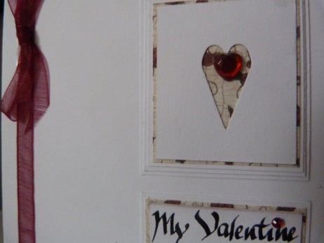 A completely handmade and uniquely designed card. Consisting of pristine white quality card which has a handmade toper of a heart cut from white card, mounted onto red flower card and mounted three times more on white card. My Valentine hand written in black ink in gothic style. Finished off with a dark red organza ribbon and bow, a red heart bead and a scattering of tiny holograph hearts