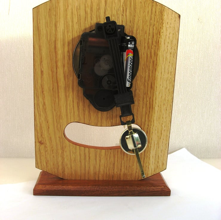 This is a handmade pendulum clock with a battery powered quartz movement with a clear off white dial with Roman figures and a brass bezel.