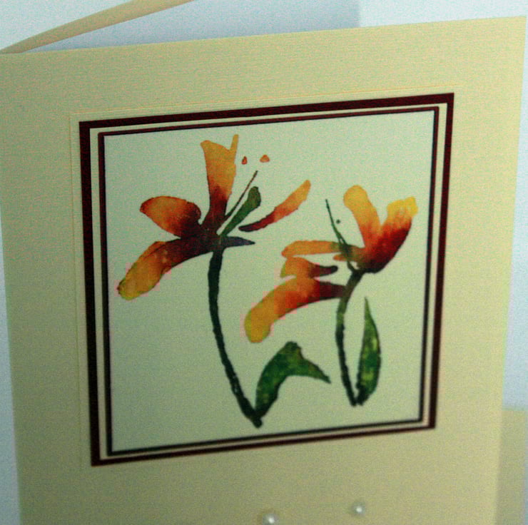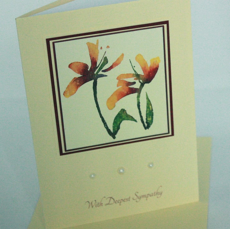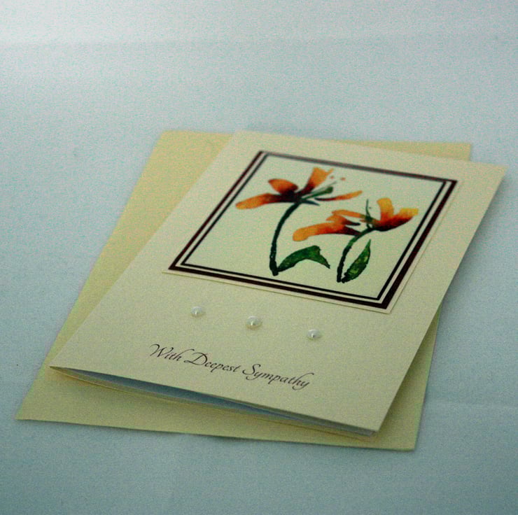 A6 sympathy card featuring a pretty image of red/orange flowers layered onto dark red paper and cream linen card. The base card is 255gsm rich cream linen card and the message 'With Deepest Sympathy' has been printed directly onto the card and finished with 3 small faux pearls. The message inside reads 'Thinking of You'.