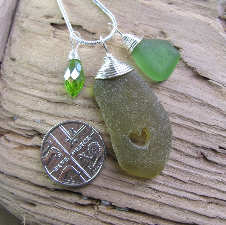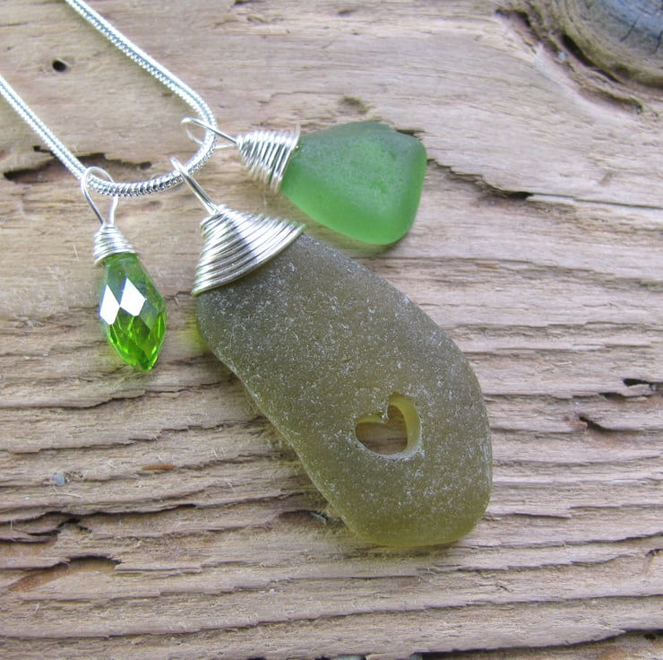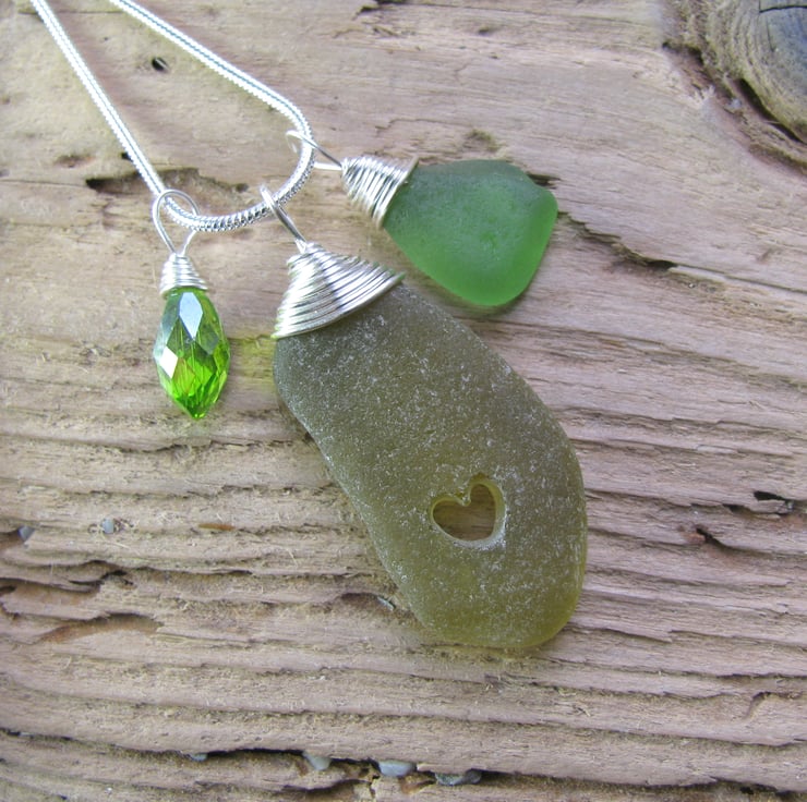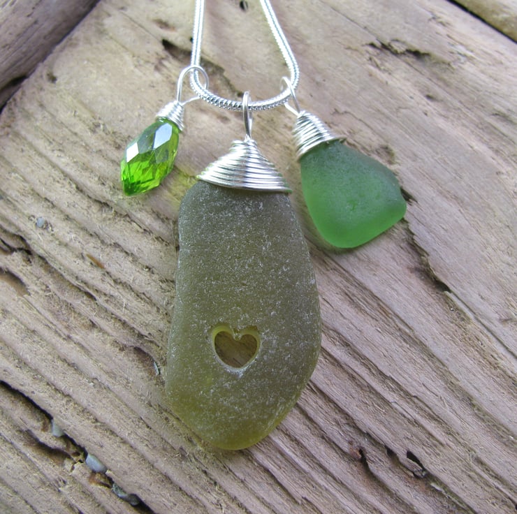 A lovely frosted olive coloured piece of sea glass with a wire wrapped bail. It has a lovely carved heart within, and a crystal charm and sea glass drop. The wire is non tarnish, and is suspended from a silvertone snake chain. Approx. 18"